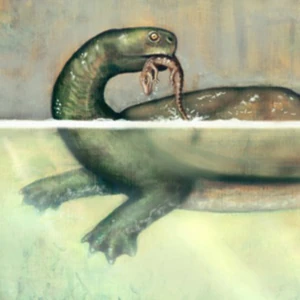 The Cerrejonisuchus swims away soon after as a Titanoboa grabs and eats the Ceratodus.