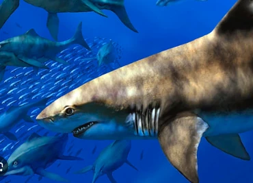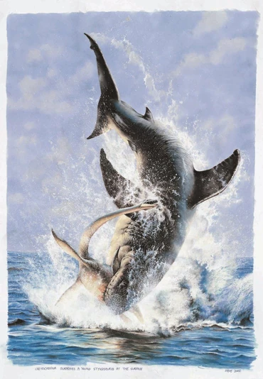 Next up we have the resident daredevil, Silas, a Cretoxyrhina Duplidentium. He is 34 feet long, 6 feet tall at the top of his dorsal fin, and 5 tons. His name means "Double toothed Cretaceous Sharp-nose", because he actually has two types of teeth. The teeth on his upper jaw are smaller and are used for ripping flesh, while the teeth on the lower jaw are used for crushing bone. Most of his body was inspired by both makos and Greenland sharks. Silas is a very energetic shark and one who always wants to eat large prey and rip it apart in the most violent way possible. He sees violence as an art form, but he never tried to kill his handlers because they're the ones who feed him, if he kills them, he has nothing left to rip apart. But then, when the park was hacked by an extremist group, Silas got out of his exhibit and swam through the connected pipelines of the park, and they were big enough to fit him in them. And eventually, he ended up at Triple Wave Lagoon, where the Plesiosaurs and the Hesperonis were. Chaos soon ensued when Silas tried to kill the Hesperonis in the exhibit, but the three Plesiosaurs, Peppa the Cryptoclidus, Marko the Mauisaurus, and Leido the Thalassomedon fought Silas to protect the Hesperonis because they saw them as neighbors. But he shrugged the Plesiosaurs off. But the problem was, he didn't know someone else was traveling through the same pipes he did. Big Duncan then swam into Triple Wave Lagoon, and he immediately rammed Silas, seeing him as a threat to the surrounding populace. The two of them fought until Big Duncan tired Silas out, enough time for the handlers to capture him and take Silas back to his enclosure. Silas' enclosure is called "Knife House" and it's filled with decorative shipwrecks and bones. The reason for the name is because Cretoxyrhina is often known as the Ginsu Shark, named after Ginsu knives. But after his rampage, he was put into a quarantine enclosure to better study his behavior. Monster Cove and it's staff aren't experimenting on him, they're simply trying to determine whether or not they should keep Silas or they should either give him to another institute or release him back into the wild. They're already planning on a possible replacement just in case Silas acts up again. It's very possible that if his behavior doesn't improve, they'll replace him with a pair of Hybodus or a Helicoprion. Though those two are still predators, their aggression pales in comparison to his.