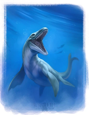 Then, we have Jet, an Ophthalmosaurus Nasferrum, he's 7 feet tall, 20 feet long, and 3.5 tons. His name means "Eye Lizard Blade Nose", because if his jaws are closed, he can use them like how a needlefish uses it's jaws, to stab prey, and he also whacks prey like how swordfish do. He has superior night vision thanks to his big eyes, he also has echolocation and his top speed is 60 mph and he can maintain that for a long time, making him the fastest animal in the park. His enclosure is Jetstream Speedway, an enclosure that looks like a NASCAR race track, and has compartments where hoops come out. Most of Jet's body is a result of convergent evolution, for the same reason Big Duncan looks longer than a real Dunkleosteus. Because Ophthalmosaurus was competing with sharks, so they evolved a body similar to mako sharks. The stripes on his fins are supposed to look like racing stripes. He has a saddle because he's one of the only animals in the park that people can ride on. The handle on the top is what guests need to hold onto during a ride, they need to put their hands in the hole in the middle, but if that doesn't work they can hold onto the top of the handle, there are also straps meant to hold in a person's legs. Jet is cocky, overconfident, but he makes sure to slow down when someone is riding him. Sometimes, Jet is taken out of his enclosure and put into Triple Wave Lagoon to perform with the Plesiosaurs and the Hesperonis, this usually happens during big events or holidays.
