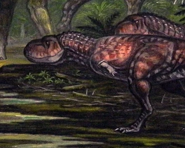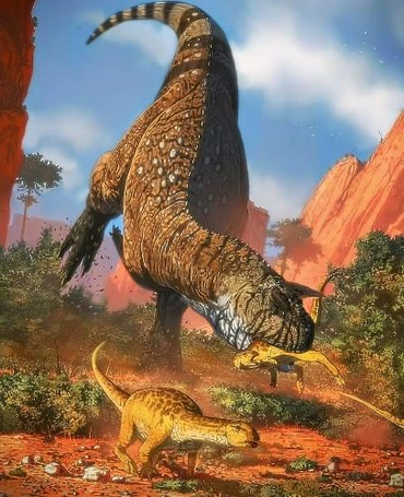 The shark-toothed lizard looked fearfully at the tyrant king approaching.