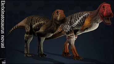 Sure enough, the skullcrawler jumps back at Ekrixinatosaurus, swinging its large tail at the abelisaur. Ekrixinatosaurus is knocked back severely, but after seconds of struggle, he gets back up. The skullcrawler rushes towards him, but he's beginning to learn to anticipate, and while not perfect, he narrowly dodges and counterattacks with a bite at the neck. He puts high pressure on the bite, but the skullcrawler kicks him off before he could fully land a killing blow.