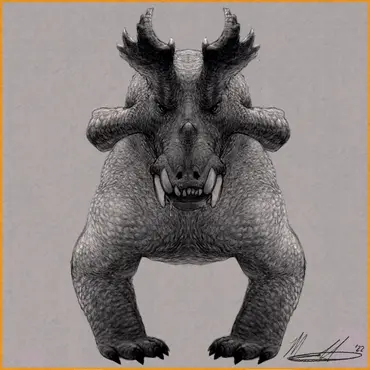 Styracocephalus begins ramming Anteosaurus, and initially has the upper hand, but then Anteosaurus grabs onto the herbivore's jugal protrusions and twists as hard as she can, breaking Styracocephalus' neck.