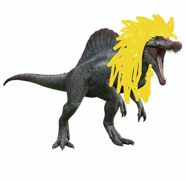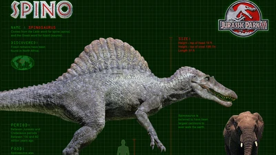And a snarl that reminded Fritz of a crocodile, only, much larger, emerged from the brush, revealing a massive Spinosaurus. This is way bigger than what Alan Grant had said in 2003. This Spinosaurus was 59 feet long. Fritz concluded that it was indeed the same Spinosaurus, merely it had grown. A lot. The Spino immediately grips the neck of the young Tyrannosaur with its jaws, breaking its neck instantly, and throwing it out of the way. "It's gonna take more than 5!" Fritz informed as he analyzed the Spinosaur's skin thickness. "Try 7!" Jeremy yells as he emerges from an empty log hiding in during the doe's assault. Jeremy fires 4 darts, while Fritz grabs a tranq gun off of a dead soldier and fires 3 more. The Spinosaurus, ever so relentless, does not fall to the 7 darts. "Try 9-AHH" A soldier yells before getting whiplashed by the Spino's tail into a tree. Fritz fires 2 more darts, and then the Spino, feeling weak, begins to retreat.