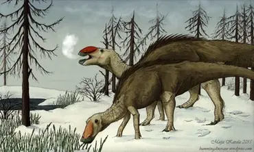 On the north slope of Alaska, a duo of Nanuqsauruses attack a 30 foot long lambeosauriane