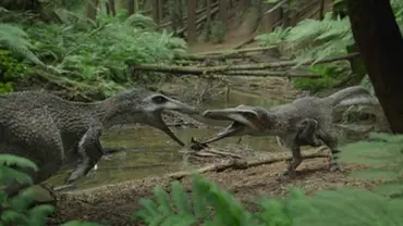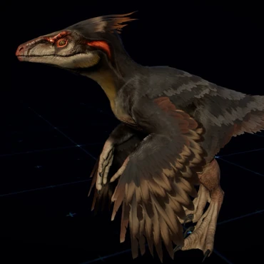 Upon flying further we spot a pack of Pyroraptors playing in the woods.
