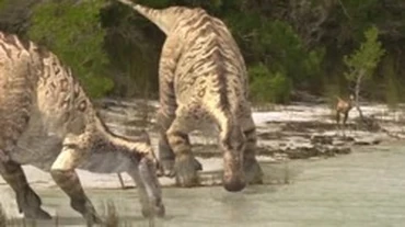 Then, the entire log that we thought was a log burst out of the water. It wasn't a log at all, it was a Suchomimus. My friends went flying into the air when this happened, so did the dog. I aimed the shotgun towards the thing's eye and fired twice. Sure enough, the thing fell back into the water.