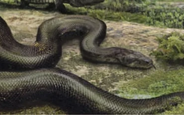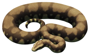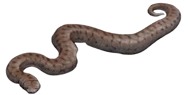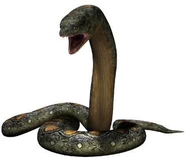 First up we have Sash, a Titanoboa Flagellufusti. She is 3 feet tall, and 55 feet long and weighs about 2 tons. Her species name means "Titanic Boa Bludgeon Whip". Her head was inspired by actual boa constrictors, she has a few spikes on her head, she has wavy, water-like stripes, and at the tip of her tail, she has a rattle like structure, but this structure doesn't rattle, she uses it to attack opponents which is where she gets her species name from. She also has a ribbon bow on her tail. And though not seen here, she does have fangs, but she doesn't have venom, she uses the fangs to pin down prey. Sash is unexpectedly kind for such a large snake. She's energetic and she likes being around people. And when she's not interacting with people, she sleeps up on logs in her paddock. The ribbon was actually something that was left in her paddock by a little girl, and she tied it on her tail because she liked it. Her exhibit is called "Titan Swamp", it's an area with a good balance of water and land, with a large log on the middle which acts as a bridge.
