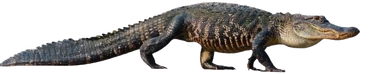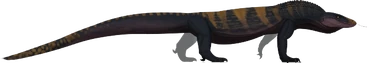 The next one may look like a crocodile, but it's not. It's actually an amphibian. Meet Gus, a Prionosuchus Ucahabitor. He is 4 feet tall, and 35 feet long and weighs about 3 tons. His species name means "Saw Crocodile Mangrove Dweller", because this creature mainly lives in mangrove areas. He has a long snout with lips, a fairly slender body, he has wavy stripes on his back, arch-like stripes on his tail fin, and he has a sail on his back inspired by newts that has speckles in it. His most notable feature is his front left arm, which is a prosthetic arm. You see, before he was taken to the park, he used to live in mangroves in which he was a major predator. In fact, he was a maneater. He openly killed humans. But one day, he met his match when he fought a particularly large saltwater crocodile, and it used it's death roll on his left arm, severing it. When he was found, he was given a prosthetic limb to help him move, and it is very effective. Though he used to be a maneater, he quite enjoys humans now because they saved him, and he especially loves it when he's cleaned by the staff once a week to make sure he doesn't have any ticks or parasites. He lives in "Mangrove Mystery", which isn't really a paddock. It's more like a massive lake in the park where visitors go on a tour in a boat going through many animals that live in the mangroves, and Gus is the last encounter on that tour, and because he no longer kills humans, visitors aren't scared to get close to him. Also, Gus was named after Gustave, a massive man-eating Nile crocodile. Also, if you're wondering why his head is way different compared to a prehistoric Prionosuchus, it's because his kind evolved to look more like crocodiles in order to better compete with them.