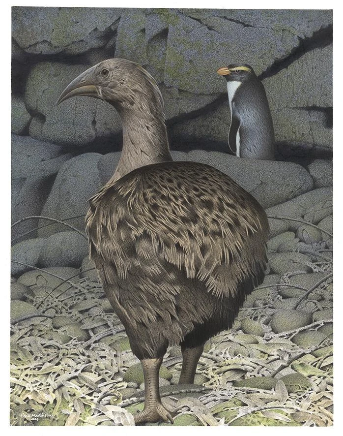 The adzebills were never as widespread as the moa, but subjected to the same hunting pressure as these and other large birds by the settling Polynesians (and predation of eggs/hatchlings by accompanying kiore and dogs). They became extinct before the arrival of European explorers.