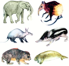| Left to right and top to bottom: African bush elephant, golden-rumped elephant shrew, aardvark, tailless tenrec, rock hyrax, and dugong | |