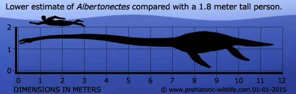 Albertonectes (Alberta swimmer) was a plesiosaur famous not only for being particularly large for its kind, but also for having one of the most complete skeletons found for any plesiosaur. It has a total of 76 tiny neck vertebrae and could reach up to 11 m long.