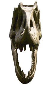 Allosaurus skull was double hinged. This allowed it to open its mouth extremely wide, allowing it to have a huge bite radius, uncommon in other theropods of its age. One hinge was near the front of the jaw like a snake's, and the other was near the back of the jawbone. However, previously it was assumed, that Allosaurus had a relatively low bite force of only 350 pounds per square inch, much less than the value of sharks and crocodiles and even inferior to that of most big cats, despite being much bigger.