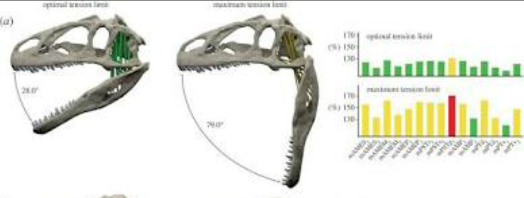 Similar conclusions were drawn by another study using finite element analysis on an Allosaurus skull. According to their biomechanical analysis, the skull was very strong but had a relatively small bite force. By using jaw muscles only, it could produce a bite force of 805 to 2,148 N, less than the values for alligators (13,000 N), lions (4,167 N), and leopards (2,268 N), but the skull could withstand nearly 55,500 N of vertical force against the tooth row. The authors suggested that Allosaurus used its skull like a hatchet against prey, attacking open-mouthed, slashing flesh with its teeth, and tearing it away without splintering bones, unlike Tyrannosaurus, which is thought to have been capable of damaging bones. They also suggested that the architecture of the skull could have permitted the use of different strategies against different prey; the skull was light enough to allow attacks on smaller and more agile ornithopods, but strong enough for high-impact ambush attacks against larger prey like stegosaurids and sauropods. Their interpretations were challenged by other researchers, who found no modern analogues to a hatchet attack and considered it more likely that the skull was strong to compensate for its open construction when absorbing the stresses from struggling prey. The original authors noted that Allosaurus itself has no modern equivalent, that the tooth row is well-suited to such an attack, and that articulations in the skull cited by their detractors as problematic actually helped protect the palate and lessen stress. Another possibility for handling large prey is that theropods like Allosaurus were "flesh grazers" which could take bites of flesh out of living sauropods that were sufficient to sustain the predator so it would not have needed to expend the effort to kill the prey outright. This strategy would also potentially have allowed the prey to recover and be fed upon in a similar way later. An additional suggestion notes that ornithopods were the most common available dinosaurian prey, and that allosaurs may have subdued them by using an attack similar to that of modern big cats: grasping the prey with their forelimbs, and then making multiple bites on the throat to crush the trachea. This is compatible with other evidence that the forelimbs were strong and capable of restraining prey. Studies done by Stephen Lautenschager et al. from the University of Bristol also indicate Allosaurus could open its jaws quite wide and sustain considerable muscle force. When compared with Tyrannosaurus and the therizinosaurid Erlikosaurus in the same study, it was found that Allosaurus had a wider gape than either; the animal was capable of opening its jaws to a 79 degree angle. The findings also indicate that large carnivorous dinosaurs, like modern carnivores, had wider jaw gapes than herbivores.