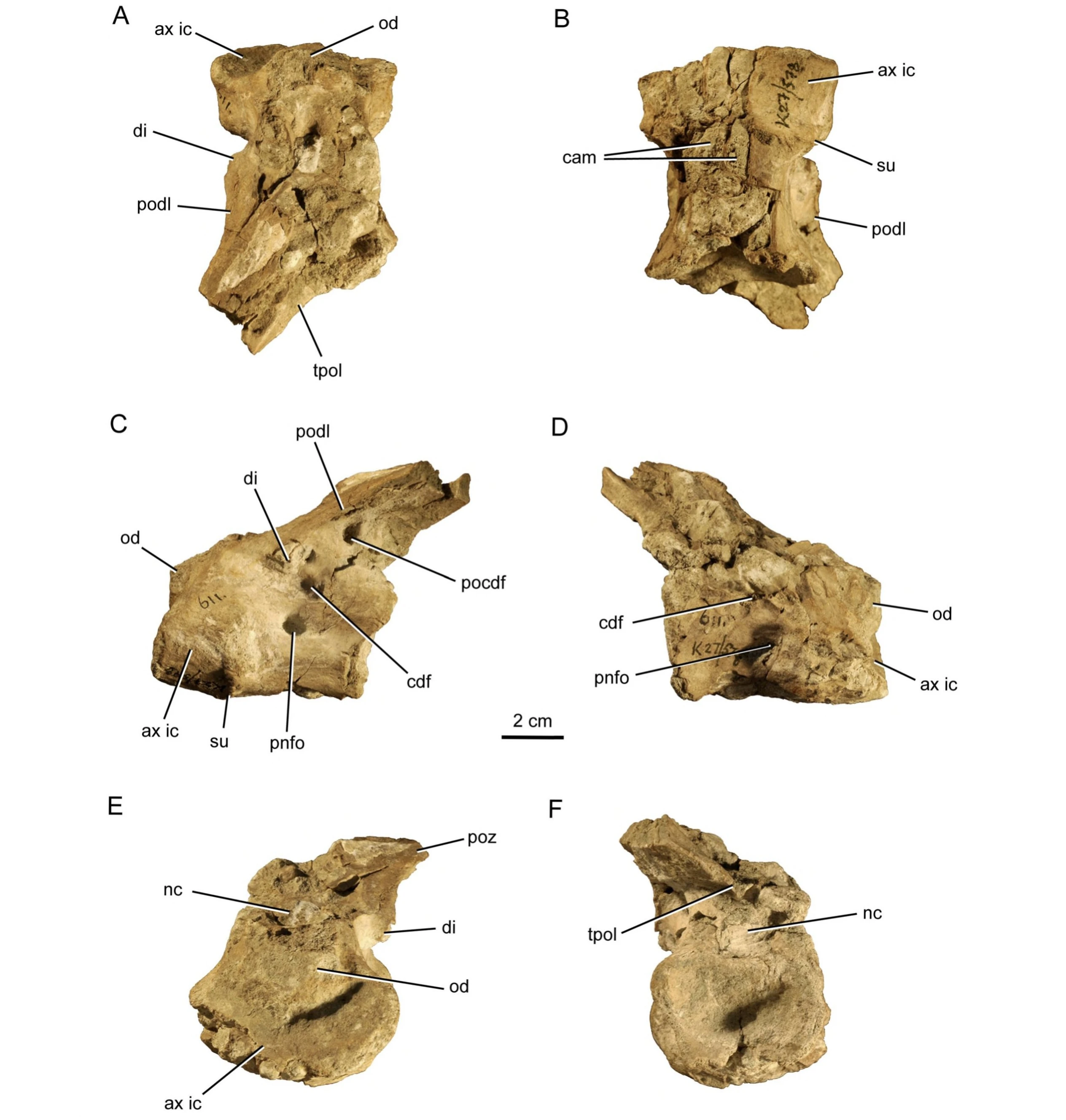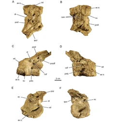 | Compsosuchus solus axis vertebra (GSI K27/578) in A, dorsal, B, ventral, C, left lateral, D, right lateral, E, anterior, and F, posterior views. | |