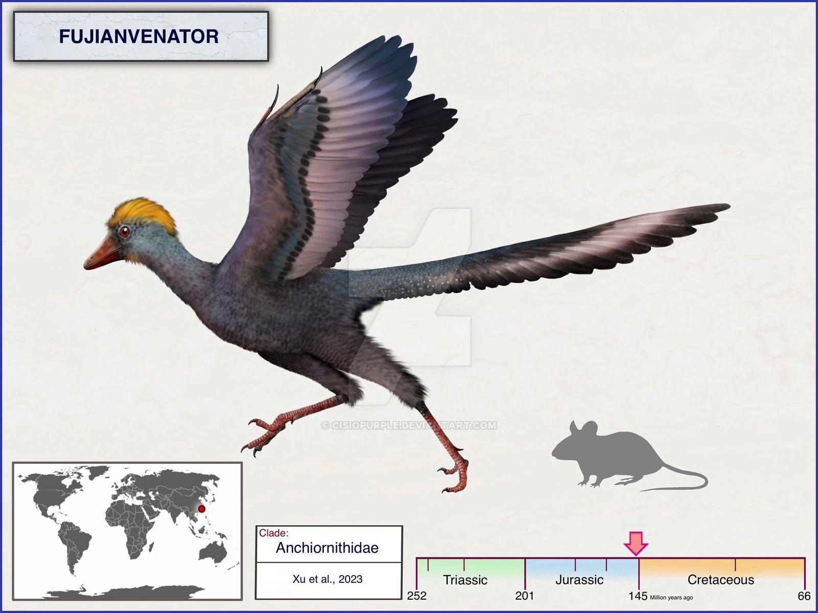 It is exact ecological role is unknown whether it have had a more terrestrial or a wading lifestyle is unclear. Its latin name's meaning is : Fujian hunter. It was a relatively small animal approximately 641 grams ~ at most. This dinosaur exhibits an unusual set of morphological features that are shared with early avialans as well as troodontid and dromaeosaurid dinosaurs. The newly-identified species roamed Earth around 150 million years ago about the Late Jurassic epoch.