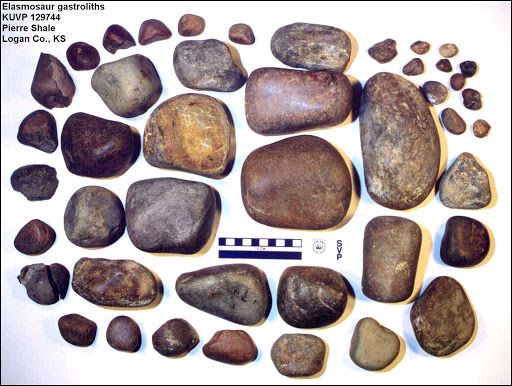 A Gastrolith is a stone that would have been consumed by a Dinosaur in order to help with or digest food. They were found in or near remains of dinosaurs/prehistoric life that lacked grinding teeth. They occurred mainly in the Jurassic era, but occasionally found in the Cretaceous. Discovered in 1906, George Reber Weiland reported pieces of worn-down pebbles near and associated with fossils of plesiosaurs and sauropods. However, Barnum Brown was the first to realize these stones were for digesting. Later, ceratopsians and toothless theropods, such as Caudipteryx, but also species such as hadrosaurids, diplodocids, prosauropods, and (rarely) ichthyosaurs, were associated with Gastroliths.