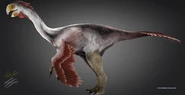 Gigantoraptor is the largest beaked theropod so far; and unlike most large theropods it had much ganglier and thin limbs. It is thought that along with other advanced coelurosaurs, the Tyrannoraptorans (Tyrannosauroidea, Coeluridae, Ornithomimosauria, Alvarezsauroidea, Therizinosauria, Oviraptorosauria (its' own group), Deinonychosauria, and Avialae), it had a large portion of its body covered with feathers used for display. It is unknown exactly what it would eat, but most people assume that it would have a diet consisting of fruit, unfertilized eggs, small and medium sized dinosaurs and more. The specimen that was found was only eleven years of age; it is most likely that this life forms adult stage was much larger. At first when it was discovered by Xing Xu it was mistakenly classified it as a tyrannosaur. It is thought that its closest relatives was Caudipteryx. Several Gigantoraptor fossils have been found on top of nests, which showed that these dinosaurs sat on the nest to protect the egg. This is similar to modern day birds.