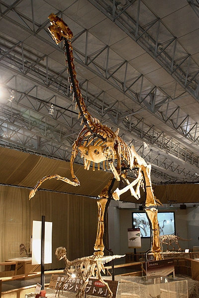 The toothless lower beak of this creature was fuse into a broad mandibula, they indicate that the unkown skull was over half a meter long and toothless also, probably equipped with a horny beak. The front tail vertebrae has a very long neural spines and are heavily pneumaticised with deep pleurocoels. The middle section of the relatively short tail is somewhat stiffened by long prezygapophyses. The back tail vertebrae are lightened by spongeous bone. The front limb is rather long because of an elongated slender hand. The humerus is bowed outwards to an exceptionally large extent and has a very rounded head. The first metacarpal is very short and carries a strongly diverging thumb. The hindlimb is also long because of an elongated lower leg. The thighbone is relatively slender and short with a distinct head and neck. The foot is robust with large and strongly curved toe claws.