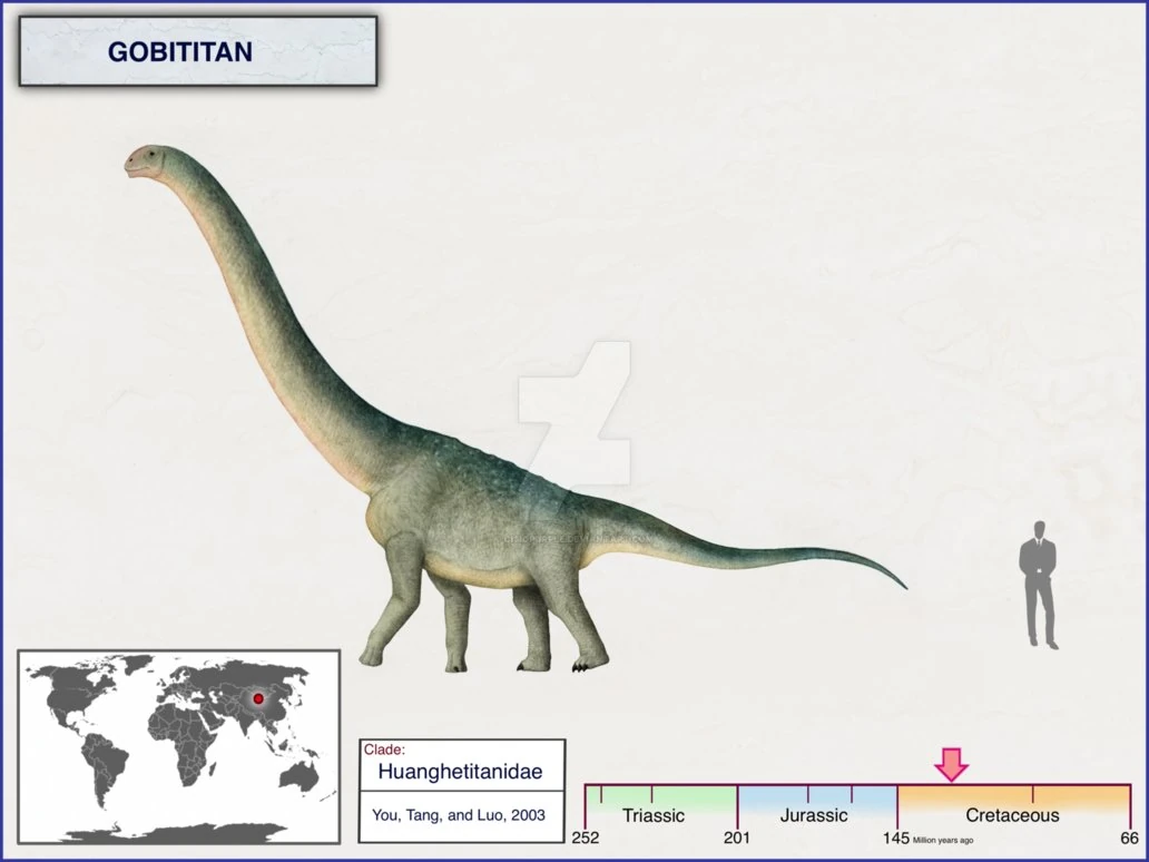 Gobititan is a Primitive Titanosaur from early Cretaceous China. Known from tail and leg bones similar to those of Tangvayosaurus.