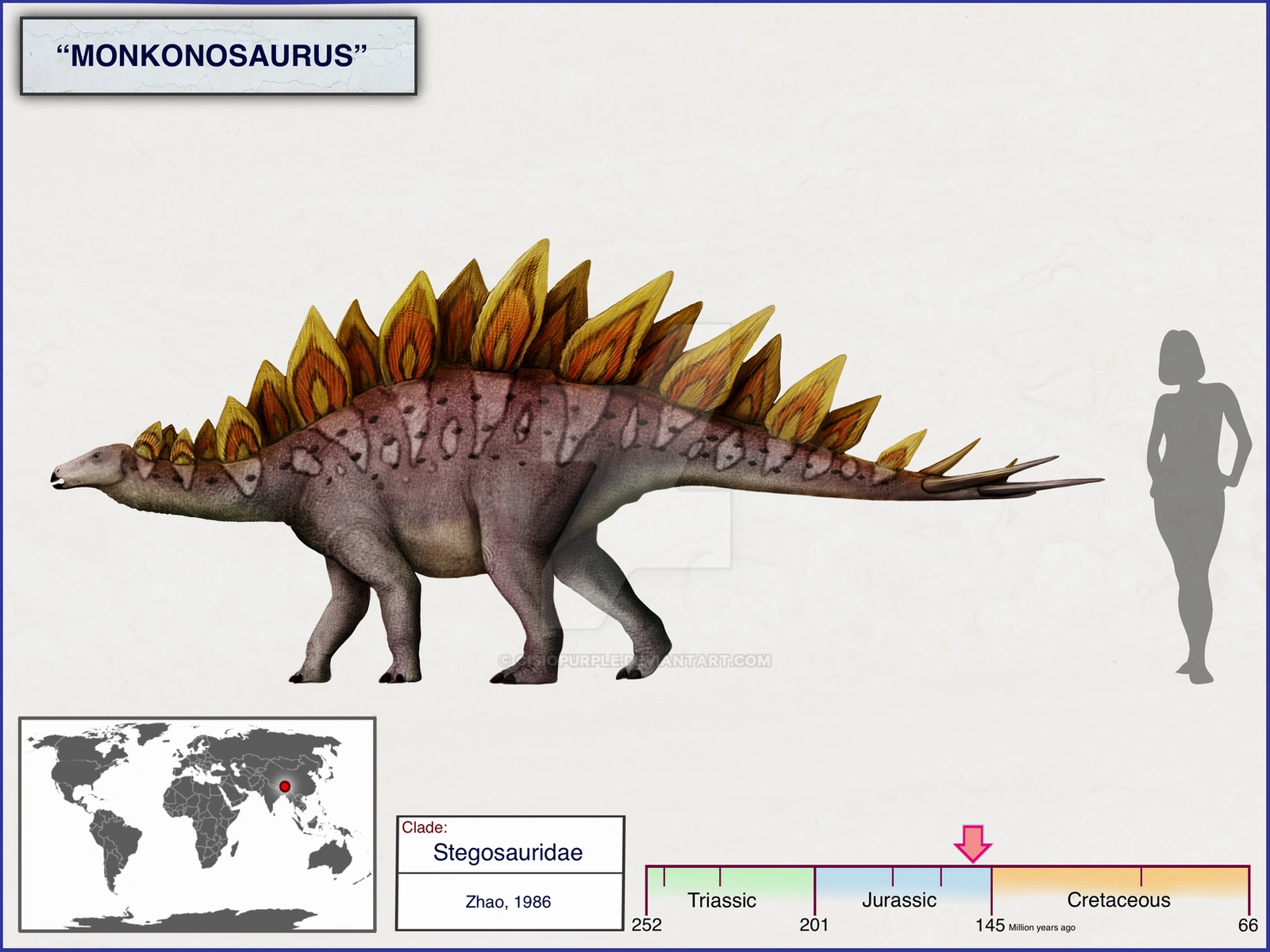 Monkonosaurus (meaning "Monkon lizard") is a dubious genus of herbivorous stegosaurian dinosaur from the Late Jurassic/Early Cretaceous-aged Loe-ein Formation of Tibet (or the Early Cretaceous Lura Formation of China). Some sources place it as alive during the Oxfordian - Albian stages, around 163 - 100 million years ago, although Monkonosaurus was probably only alive during the Kimmeridgian (157.3 – 152.1 ± 0.9 million years ago).