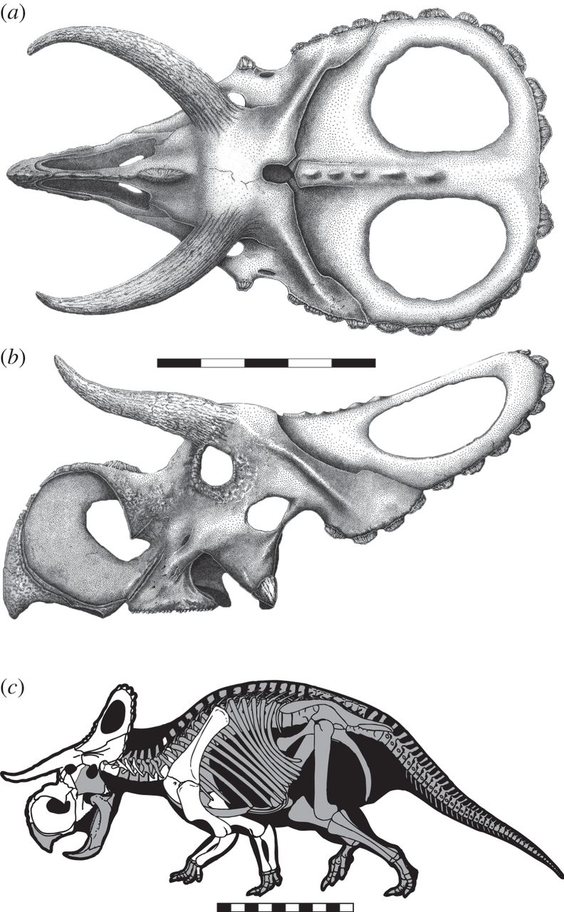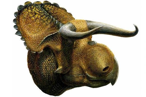 Like other dinosaurs in the triceratops family, the quadrupedal herbivore, which measured about 15 feet and weighed some 2 tons, has a frill on its head, like a misshapen halo backlighting its face.