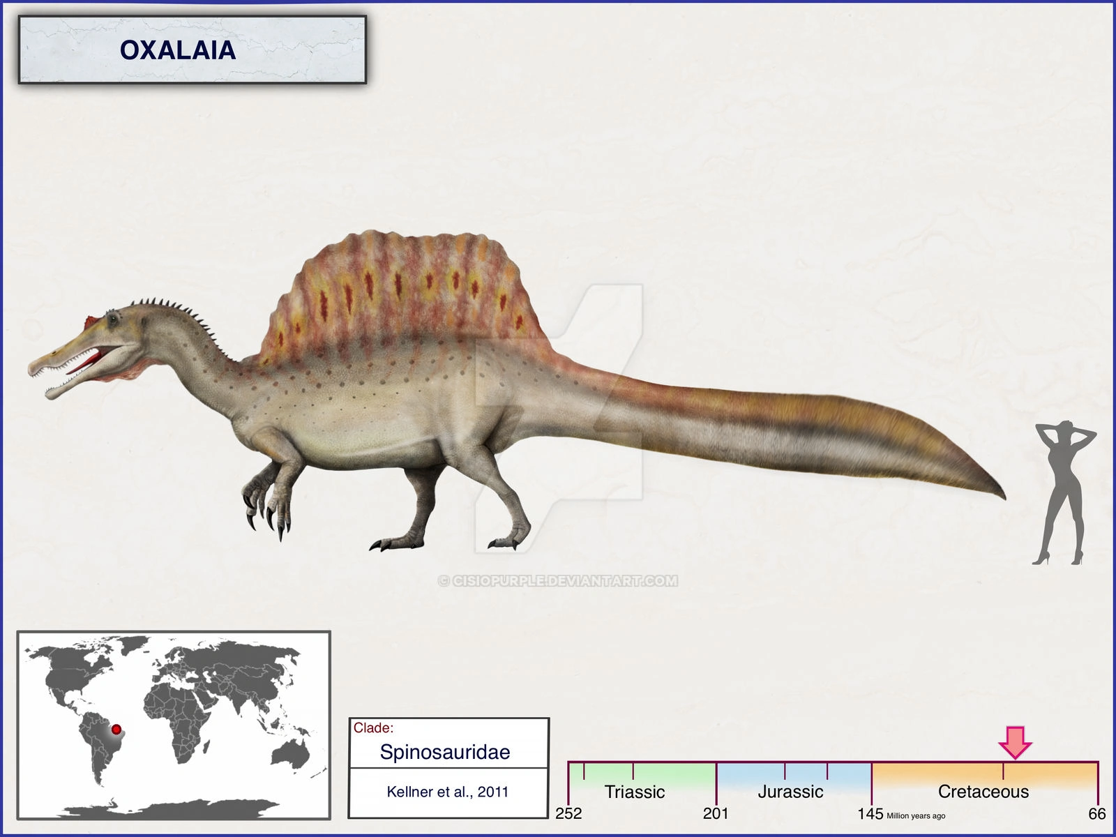 Oxalaia is a genus of large spinosaurid theropod dinosaur, which lived in late Cretaceous Brazil during the Cenomanian age. The type and only species of Oxalaia is O. quilombensis. The animal noted to resemble one of its closest relatives Spinosaurus, but studies have shown that it has more than enough physical differentiation in morphology to be considered its own genus.[1][2]