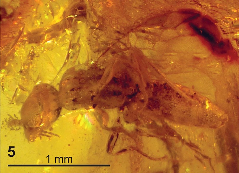 Plumalexius in a peace of amber.