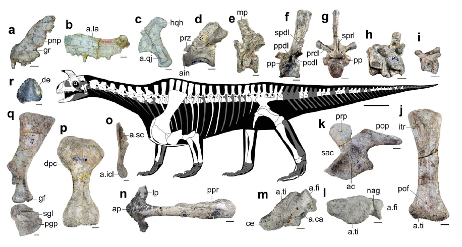 Ilium has a well developed semi-circular pre-metabolic process and a longer, dorsoventrally shallow postacetabular process. The acetabulum is entirely closed and anterodynamically delimited by a low and thick supra-acetabular ridge. The pubis has a transversely broad apron that contacts its counterpart and, proximally, extensive contact with ischium. The femur is sigmoid with a prominent internal trochanter that does not converge with the femoral head as in A. madagaskarensis and Trilophosaurus buettneri. The distal end of the femur is transversely wider than the proximal end and the fibular condyle is slightly more Distally extended than the tibial condyle.[1]