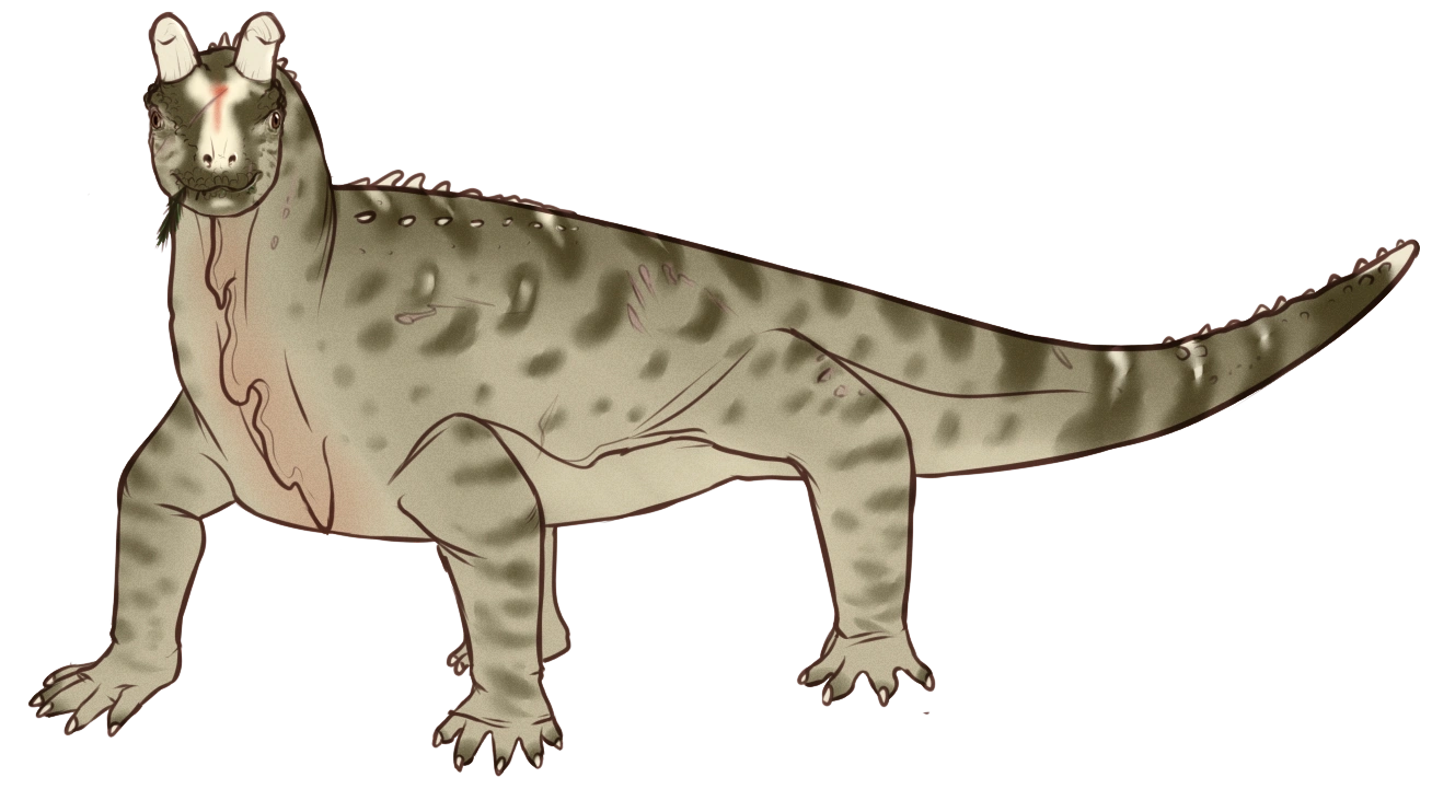 The marginal crowns of the tooth are weak, with a slightly bulbous base and numerous denticles on both margins, resembling those of Pamelaria dolichotrachela. The prefrontal and postfrontal are thick and almost exclude the front of the orbit boundary. The prefrontal, nasal, frontal and postfrontal on each side of the skull are fused to each other in large individuals (ie, the bones remain unmelted with their counterpart on the sagittal line). The roof of the skull has a curved anterior conical bone horn, almost equal in height to the rest of the skull in large individuals. Fragments of shells show that the base of the horn occupies the frontal width and the largest of the transverse width of the pachyostotic cream roof. The surface of the horn is decorated with tangential roughnesses and grooves, characteristics which have been identified as osteological correlations of cornified sheaths. 21 The parietal has a very narrow supratemporelle fossa which is separated from its counterpart by a broad flat surface, devoid of a sagittal crest. The quadrate has a dorsal end in the form of a hook, as occurs in other allokotosaurians. The crowns of the Vomerine are more lanceolate than those of the marginal dentition. The parabasphenoid has a main axis oblique, anteroventrural.[1]