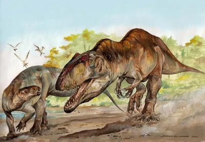 A Tenontosaurus being attacked by an Acrocanthosaurus
