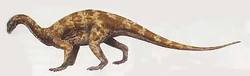 Thecodontosaurus is an extinct genus of herbivorous basal sauropodomorph dinosaur which lived during the late Triassic period (Norian and/or Rhaetian age). Its remains are known mostly from Triassic "fissure fillings" in South England. Thecodontosaurus was a small bipedal animal, about 2 meters (6.5 feet) long. It is one of the first dinosaurs that were discovered and one of the oldest that existed. Many species have been named in its genus but only the type species Thecodontosaurus antiquus is seen as valid today. It lived 203-201 MYA.