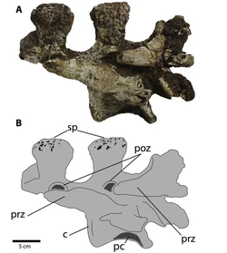Additionally, the assignment of the caudal vertebrae to the middle of the tail was also questioned by Poropat et al.. Features in these vertebrae that are unusual for middle caudal vertebrae include the prominent transverse processes bearing deep diapophyses (articulations with the ribs), the pronounced prezygodiapophyseal laminae connecting the prezygapophyses and transverse processes, the well-developed spinoprezygapophyseal laminae connecting the prezygapophyses and neural spines, the deep indentations on the outer margins of the bottom of the centra, and the postzygapophyseal facet joints extending backwards from the midpoint of the side of the centra. The size of the transverse processes suggests that the vertebrae actually originate from the front of the tail, making their association with the ischium questionable due to their overall small size. For these reasons, Poropat et al. reassigned Triunfosaurus to the Somphospondyli, being unable to confidently support its titanosaurian affinities due to its problematic nature.[2]