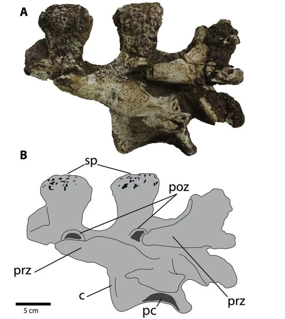 The vertebrae from near the front of the tail have short and robust processes, or prezygapophyses, on their front edges; these processes are also slightly angled upwards from the horizontal. At the top of the vertebrae, the neural spines are small and bear processes along their midlines that are expanded near the top. On the side of the vertebrae, the transverse processes are placed near the back of the bones, and are also slightly angled upward. The back half of the sides of the centra are strongly concave, while the depressions on the sides of the vertebrae known as pleurocoels are rather small. The internal textures of the centra are not sponge-like, or camellate.[1]