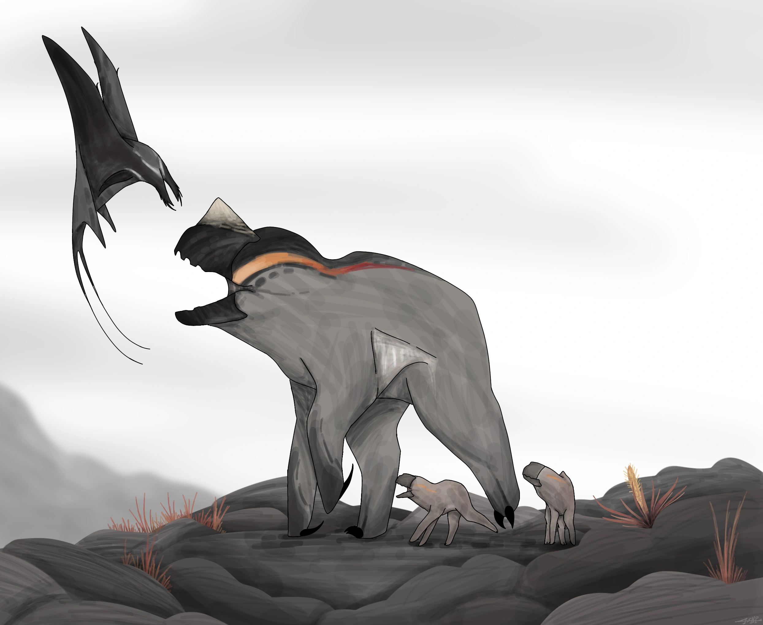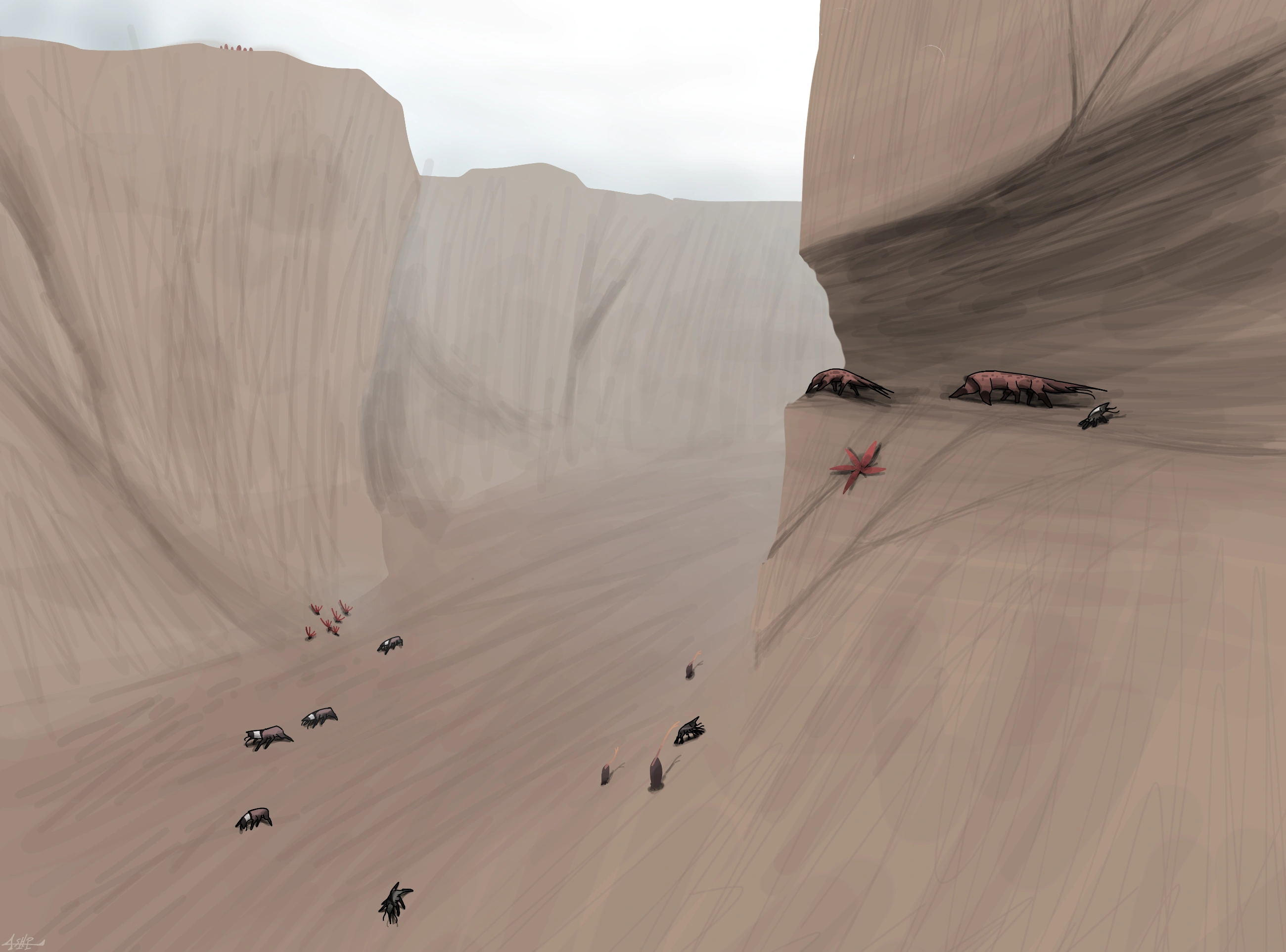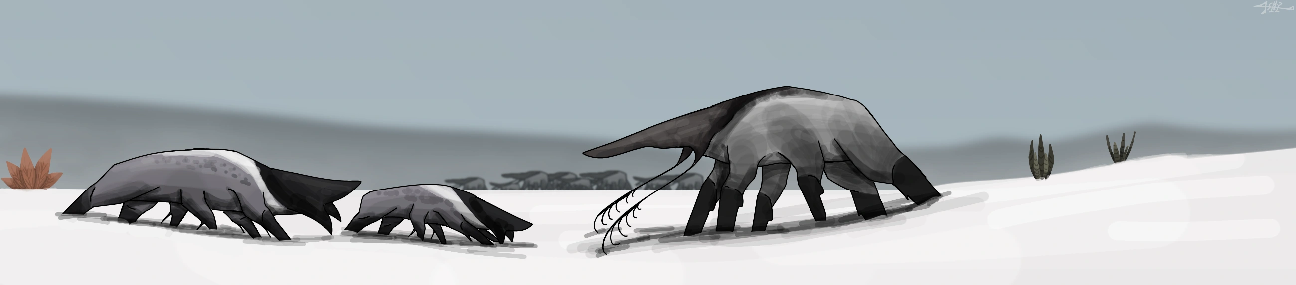 probably the most barren and could even give the feeling that it is almost entirely empty, with nothing else but a flat seemingly empty surface, with small hills, basically what Eremos looks like, but there's still life here, entering the small, scattered burrows, the Adynatocephale feed anything they can find underground as they have small, almost minuscule claws to dig, resulting in small yet interconnected tunnels, but they are not safe from the Xergiosiceps, a distant relative species with a predatory and nocturnal lifestyle. when the Adynatocephale come out of it's burrow to find any available water in their enviroment, which oftens happen at nightime, the Xergiosiceps searches for them and waits for the perfect time to strike, they also hibernate during the colder seasons to conserve their energy.