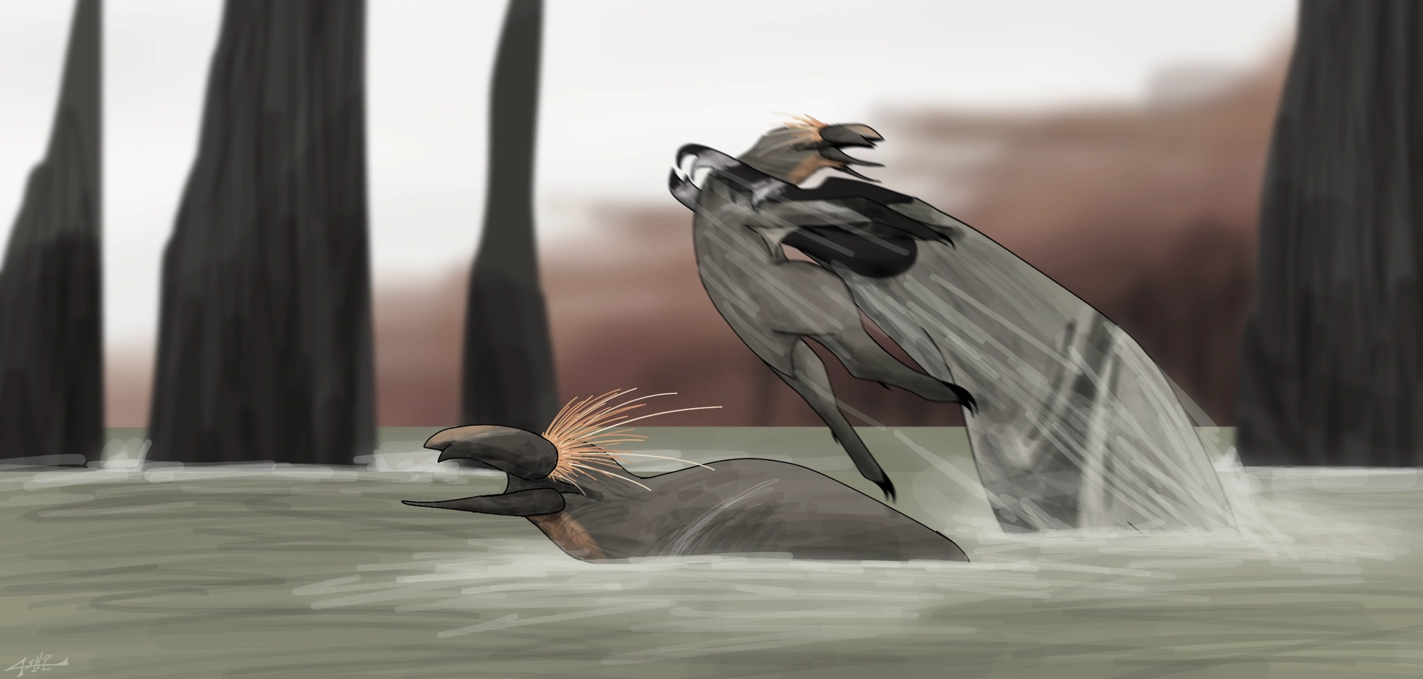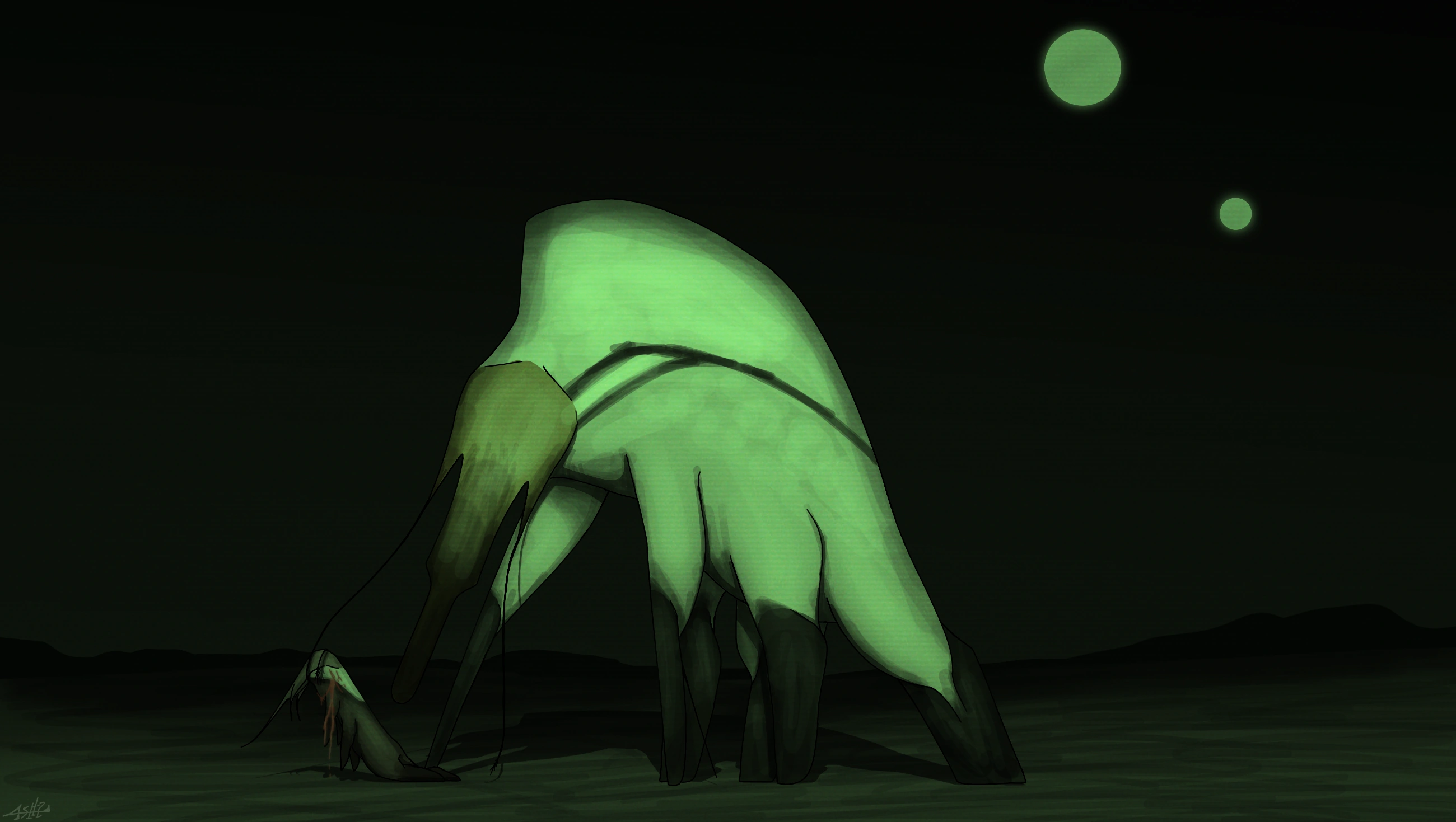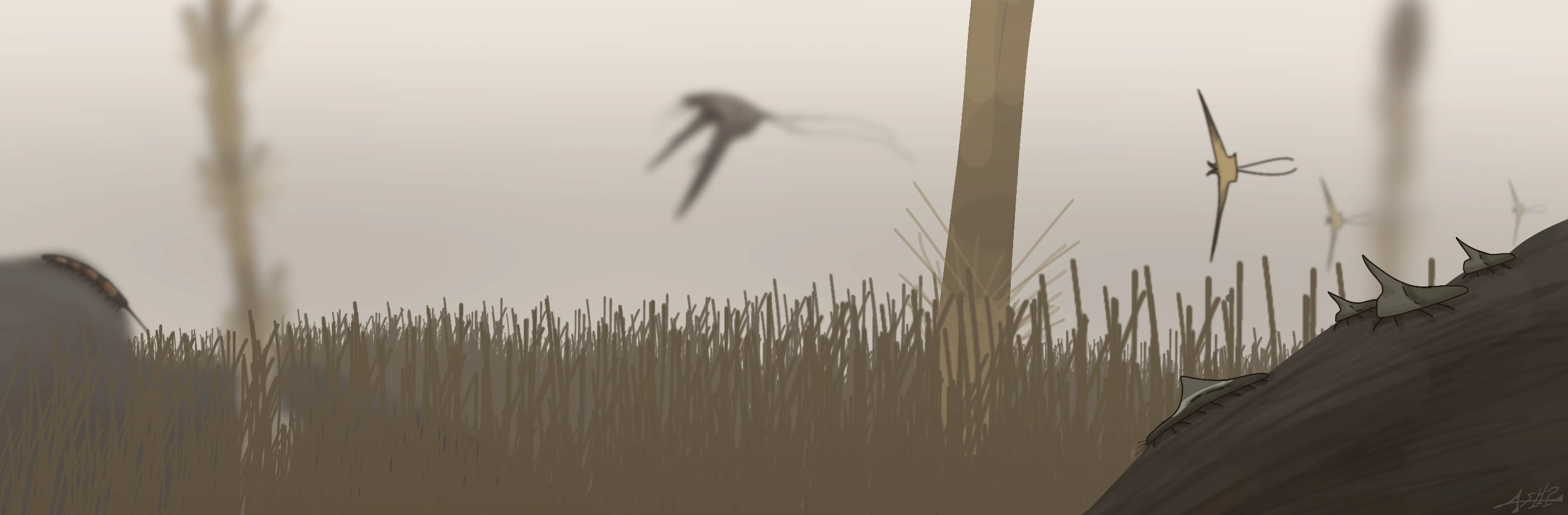 probably the most barren and could even give the feeling that it is almost entirely empty, with nothing else but a flat seemingly empty surface, with small hills, basically what Eremos looks like, but there's still life here, entering the small, scattered burrows, the Adynatocephale feed anything they can find underground as they have small, almost minuscule claws to dig, resulting in small yet interconnected tunnels, but they are not safe from the Xergiosiceps, a distant relative species with a predatory and nocturnal lifestyle. when the Adynatocephale come out of it's burrow to find any available water in their enviroment, which oftens happen at nightime, the Xergiosiceps searches for them and waits for the perfect time to strike, they also hibernate during the colder seasons to conserve their energy.