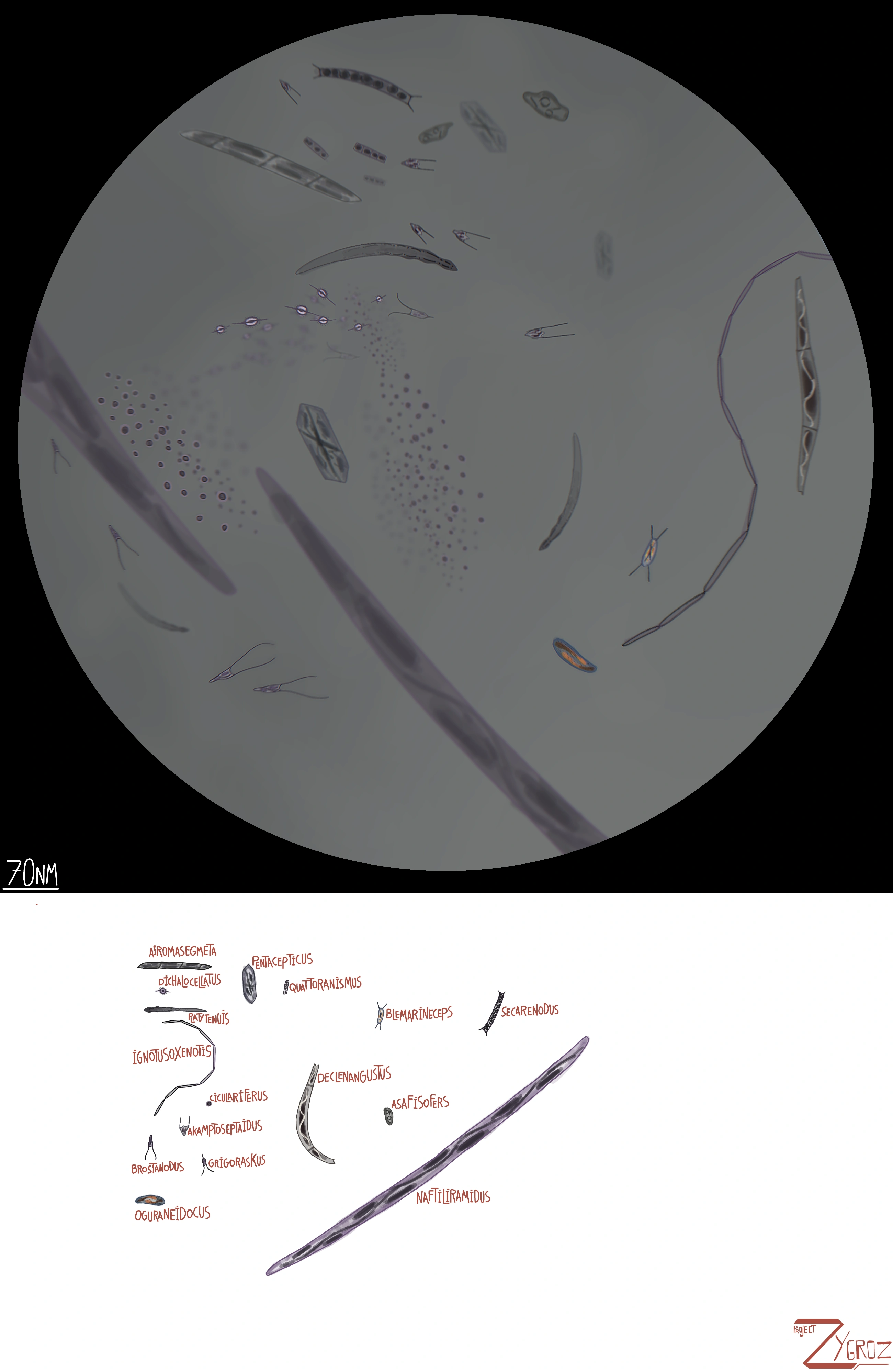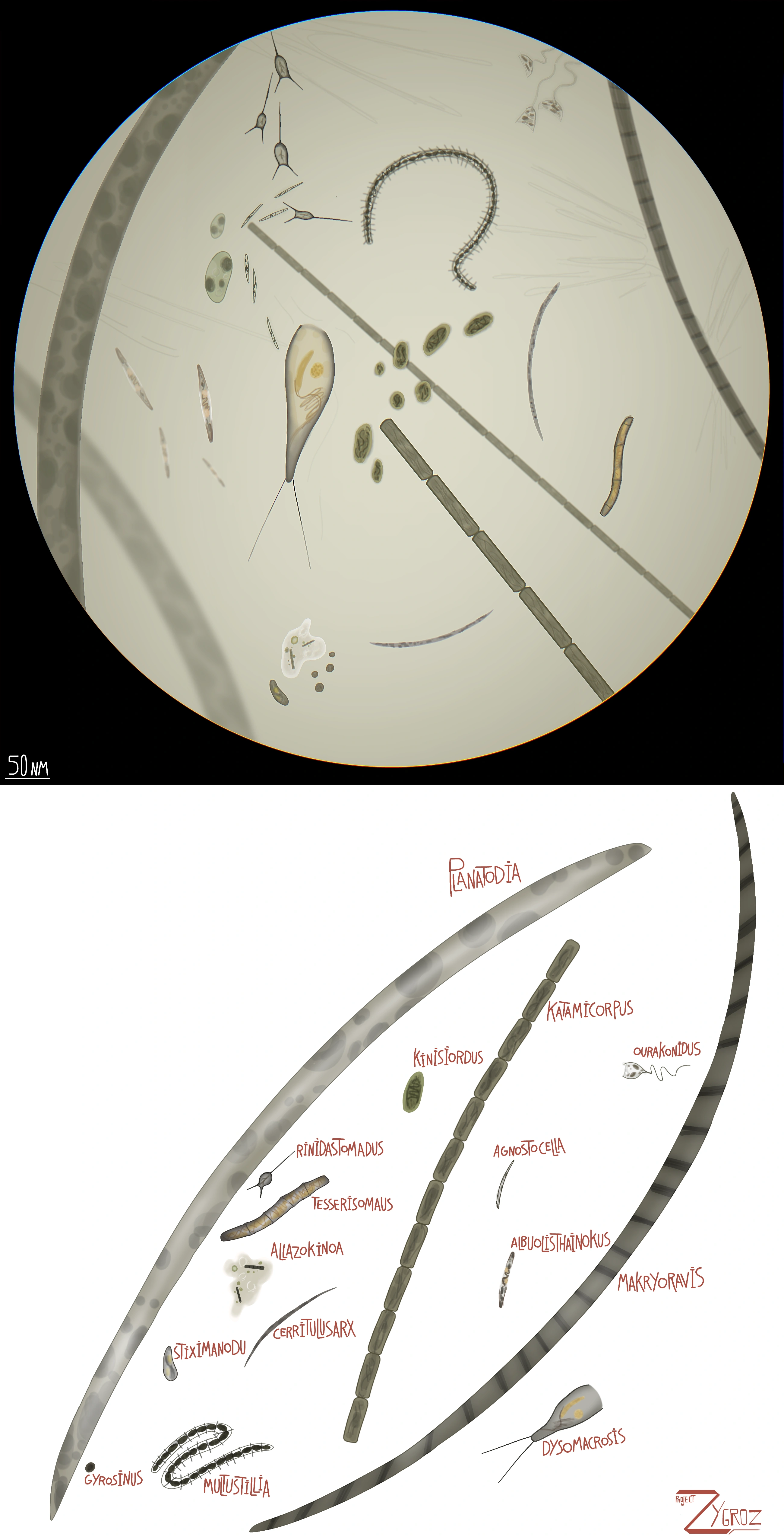 none of the known Zygrozian Microorganisms were either fauna or flora. Sinnu Rivus and the Collosu Sea host a wide diversity of microscopic and unicelluar organisms, with some species that act as decomposers, and others form the base of the food web and are fed on by filter feeders, and while some move with the use of cilia that surround their bodies, others like the single celled organisms move around with the help of psuedopods, similar to earth's amoebas.